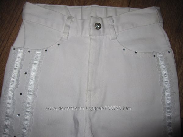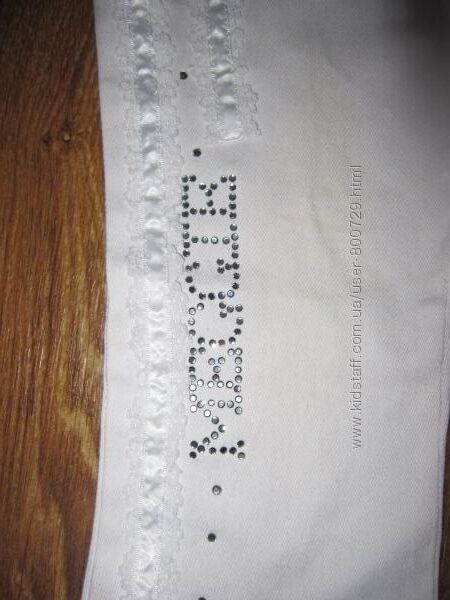 Нарядные гламурные брючки украшены лентами, кружевами и стразами. В состав входит стрейч- брючки удобны в носке.Размер: 7