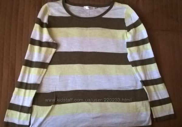 Продам новый женский свитер размер 48 (L) .Свитер из тонкой ткани: плотное, тонкое сетчатое переплетение. Мягкий, приятный на ощупь материал, Круглый вырез. По всему рисунку - широкие полосы в оттенках белого, желтый и хаки.