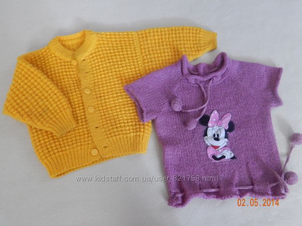 ФОТО 1 Желтая очень теплая толстой вязки, длина рукава вместе с плечом 40 см. Состояние отличное. Цена 70 грн. Сиреневая жилеточка с Микки: ПРОДАНА,Фото 2-3. Кофточка красивой вязки. Фабричная. Длина по спинке 28см, рукав 42см.