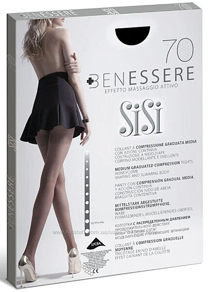 Эффект "BENESSERE" (специальная вязка "объёмные соты") стимулирует кровообращение и дарит мгновенное ощущение легкости ногам. Рекомендуется при появлениях первых симптомов венозной недостаточности для предотвращения отёков, покалывания и капиллярной хрупкости.