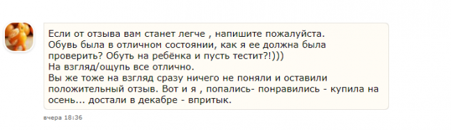 В отличии от горе-покупателя, грязью никого поливать не хочу и не буду. Девушка купила абсолютно НОВЫЕ сапоги, перед покупкой потребовала дополнительные фото(хотя их уже было 10), я сделала ей фото. Ответила на все интересующие вопросы. Она купила. Получила их. Отписалась что в восторге и благодарна. Проходит неделя и она вновь обращается ко мне , но уже с претензией. Мол протекают - верните деньги. Я ей объясняю , что знать не могла что они будут течь. Вернула бы однозначно, если бы продавала ношеную обувь и обещала что не текут-проверенные. А в данной ситуации, считаю себя абсолютно правой. И желаю всем ставить прежде всего себя на место других.