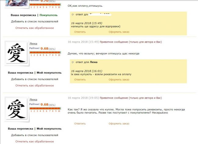 Таких покупців я ще не зустрічала.. сказати що я в шоці - це нічого не сказати... гадаю адміністрація сайту тут розсудить чи заслужено ви мені написали таке в гостьовій, ну й нехай інші користувачі висловлять свою думку...