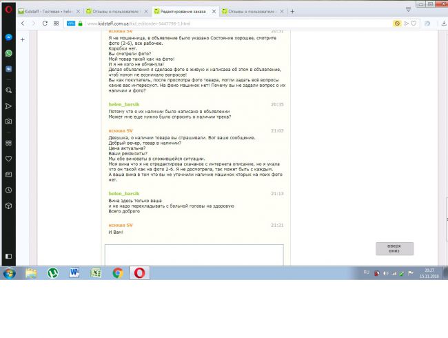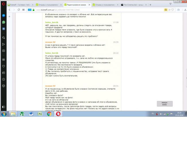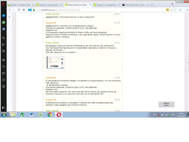 Заказала трек-парковку. В объявлении было указано: "Комплектация 6-ти уровневая парковка с лифтом, 4 МАШИНЫ Размеы 41х53х20...". Посылка пришла без машинок. На мою претензию - продавец заменила текст своего объявления (убрала из наличия машинки) - ЭТО ЛИ НЕ МОШЕННИЧЕСТВО? и написала мне что я не внимательно читаю объявления и это не ее проблема. Когда я скинула ей скрин ее объявления до "корректировки" - она написала что я должна была спросить о наличии машинок. Данную проблему решать отказывается. Фото этого объявления до коррекции и фото нашей переписки прилагаю.