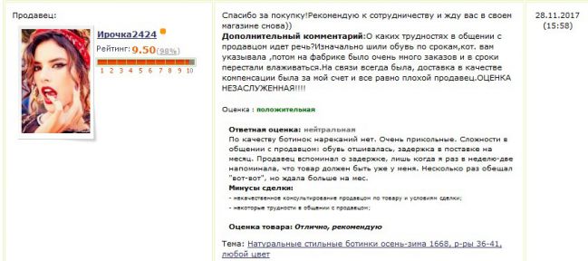 Было несколько моментов. 1 - задержка в месяц. Товар должен был быть изготовленным до 1 ноября (заказ 16 октября, срок изготовления 5-12 дней). Понимаю, что задерживает изготовитель, но о задержках должен ведь уведомлять продавец меня. А по факту я пишу ей 2 ноября и спрашиваю, когда будет мой заказ. Продавец отвечает - на след. неделе. Ок. Жду. 9 ноября ни слуху, ни духу от продавца - пишу снова я. В ответ - не готовы, но скоро будут. Говорю - давайте возврат. Пишет, что возврат невозможен, давайте я вам в качестве компенсации сделаю доставку НП за свой счет. Жду еще 2 недели. Пишу ей 23 ноября 2017. Обещание - на след. неделе. Тут уже срок выполнен и 27 ноября мне отправляют посылку.