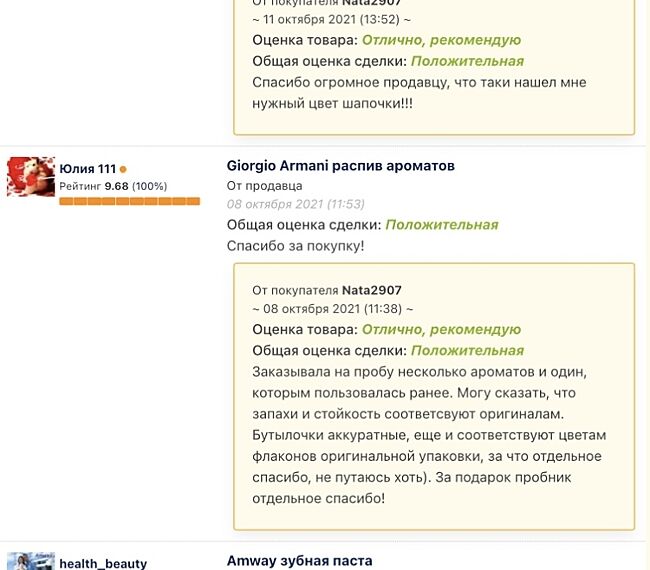 Являюсь постоянным покупателем Юлии и очень довольна качеством, парфюмерии,уважительным отношением к покупателю и оперативной отправкой.