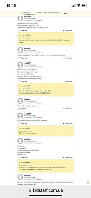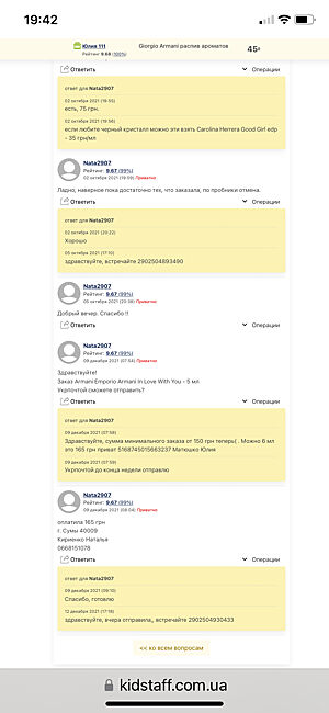 Довго думала, писати відгук чи ні, вже багато часу пройшло з моменту замовлення. Але осадочок таки залишився. Брала на пробу кілька парфумів, до цього тестила їх. Один з них прийшов зовсім не той, інші як водичка, не стійкі зовсім. Так і стояли вони. Допоки не придбала повну версію. Вона взагалі відрізняється, нічого спільного. Продавцю написала, відповідь що то мені так здалося, і все оригінальне.
