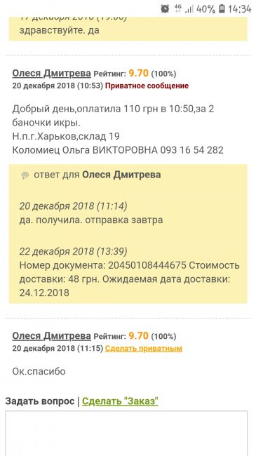 27 ноября 2018 очень странный покупатель. получил 1 банку икры. написала что она не понравилась ей по вкусу и потребовала что бы ей вернули деньги. после того как я ей написала что вкусовые качества разные и не всем все нравиться начала пугать богом. кармой. угрожать родственниками..... вообще писать не адекватные вещи. написала что вернет мне открытую банку и должна оплатить все пересылки. после очередного отказа начала угрожать тем что будет писать всем моим покупателям... и писать гадости обо мне и товаре. я нормально пыталась объяснить что в описании все указано. что икра не кеты и нерки. и вкусы у людей разные. она нашла какую то нелепую ссылку и угрожала что будет ее кидать всем покупателям.....перейдите пожалуйста по ней и посмотрите что там продают. желатиновую икру по 100 грн за 500 гр. откройте просто все объявления этого продавца и сами все увидите. если кто то сомневается в правдивости моих слов могу сделать скан переписки. прклены. угрозы и в итоге такой отзыв....