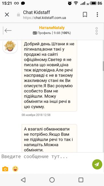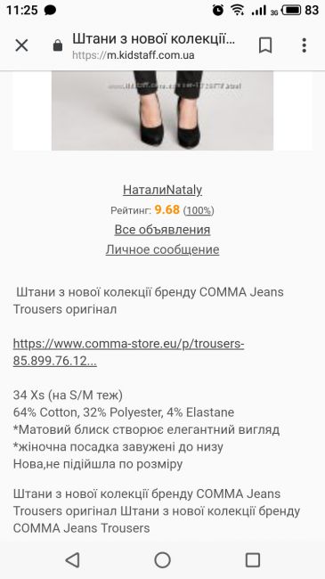 Вот примерно так.... Это если шапошно. Человек странный, очень. На белое говорит черное.... Капец Скинула скрин что было в объявлении. Видно да? Написано новые, не подошел размер. Пришло недоразумение со срезанной биркой, на штанах затяжки, запах..... но вишенкой стал конечно же низ. Видно? Уважаемые потенциальные покупатели? И это дама говорит что такое ей приехало с официального сайта. Рыдать от такого охота. Уперта, врет. Откровенный секонд. Не рекомендую. Во всяком случае требуйте доп описание, фото или наложкой. Будут вопросы, пишите в личку, предоставлю сканы переписки и доп фото. Упадете.