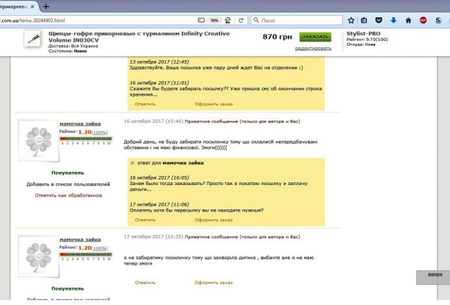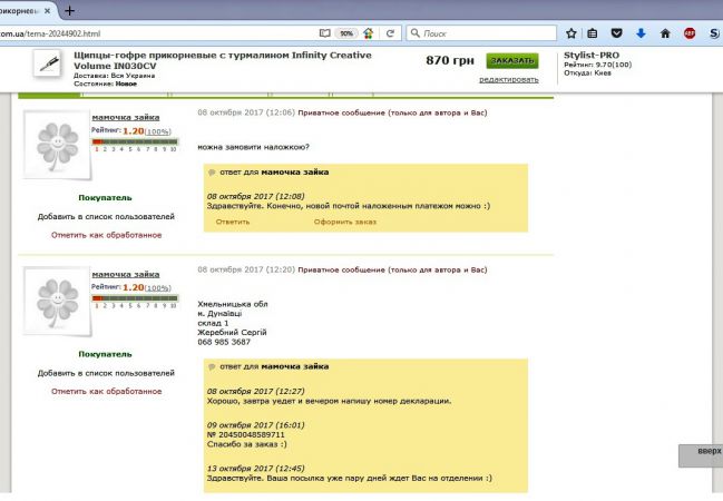 Сама история: сделала заказ наложенным платежом в воскресенье (08.10), посылка уехала сразу же на следующий день (пн. 09.10), прибыла во вт. (10.10). Еще через три дня (13.10) я напомнила о ней и начала смотреть была ли заказчица на сайте вообще.