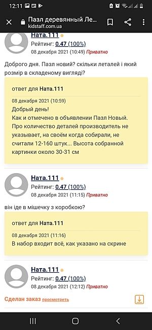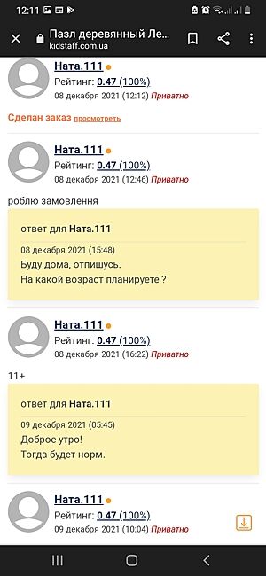 Пользователь, оформил заказ на пазл, и на протяжении суток, задавал вопросы, ответы на которые уже есть в объявлении! А он новый, а он в коробке, а он в мешочке... хотя всё это видно на фото товара представленного в объявлении! Так как бронь товара 24 часа, а прошло уже больше, и по такое й приятной цене другие покупатели готовы его купить сейчас, а пользователь всё не отвечает, то заказ был отклонён! Но нет, пользователь решил написать свой необоснованный негатив!