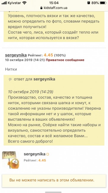 Пані Svetlanka15, якщо ви вважаєте, що можете мене зачепити цією брехнею, то можу вас запевнити, що ви помиляєтеся. Я надаю всі скріни нашого спілкування, де кожен може перечитати та зробити свої висновки. На жаль для вас ці висновки будуть невтішними. Кажете що я з вами не віталася, перегляньте уважніше мої коментарі. Доброго дня! – це для вас не вітання? По друге, які дивні питання я вам задала? Я вам поставила лише два запитання: 1.Чи можна поглянути на фото, в яких кольорах є даний комплект? Так як ви вказали в об’яві, що маєте різні кольори. А на ділі пишете, що в наявності маєте лише темно сірий, а інші під замовлення. Це вже мене насторожило!!! А друге запитання було: «2. Яка якість виробу?» Яке ви чомусь вважаєте «неграмотним». Якщо ви не розумієте української мови і у вас з цим виникають складнощі, я вам пояснила на російській мові, що мене цікавить, у відповідь на ваше запитання. Більше жодного питання я вам не ставила і мені не зрозуміла ваша неадекватна поведінка. В об´яві жодного слова про склад виробу, лише вказано що флісова підкладка. А мене, як і кожну маму, цікавить чи є у складі виробу натуральні нитки, чи лише синтетика, чи не буде холодно моїй дитині. Та для вас це все «неграмотні питання».Чомусь це «неграмотне питання» вас так сильно зачепило, що ви увесь свій вчорашній день приділили моїй сторінці для написання скарг на мої об’яви)) По третє, тиждень це сім днів, я вам написала через чотири дні і на то були причини. Я не зобов´язана перед вами звітувати, чому мені було не до покупок. Уявляєте, іноді у людей з’являються форс-мажорні обставини. Та взагалі це не ваше діло коли мені і що запитувати. А ви показали своє гниле нутро, хамство, невихованість та безпідставну агресію. Мені все одно на ваш рейтинг, потрібно лишатися в першу чергу людиною! Будь ласка, та я вам відгук у гостьовій не лишала, а поставила питання. Висновок один – людина має нульовий рівень культури спілкування та поваги до інших, вкрай невихована. Застерігаю, будьте обережні з такими людьми, бо брехати пані Svetlanka15 навчилася добре.