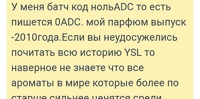 Какое вы имеете право писать что фейк если вы не умеете читать батч код ???Я вам предоставила уже расшифрованный батч код на самых известных двух калькуляторах где видно какого года ,месяца выпущен парфюм, какой фейк ??? Кто хочет с пользователей проверить мою порядочность почитайте переписку с этим пользователем ,речь идёт о парфюме Yves Saint Laurent Parisienne в моей витрине. Вы дорогая сначала разберитесь какие батч коды били по какой год по данному бренду а потом умничайте.ПРОДАВЦЫ БУДЬТЕ БДИТЕЛЬНЫ !!!!