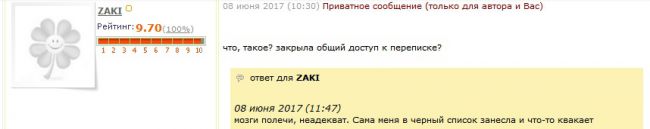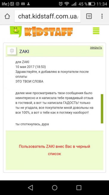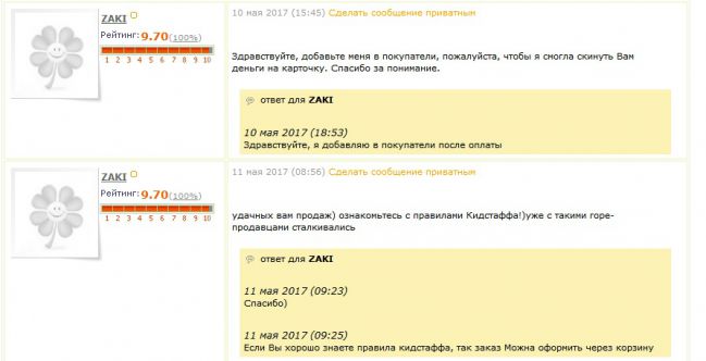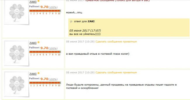 Данный продавец, пишет на правдивые отзывы в вашей гостевой гадости! И по-хамски общается, о чем свидетельствуют неоднократные отзывы о данном продавце. На неоднократную просьбу добавить меня в покупатели отказывается и требует сначала оплатить товар! После того как ставила ей отзыв и соответственно внесла такого продавца в черный список, чтобы в дальнейшем мне не попадались ее товары, продавец меня начала меня оскорблять, на что получила соответствующий ответ. После этого, продавец закрыла общий доступ к переписке, сфотографировала, соответственно, мою реакцию на свои оскорбления (свои оскорбления не показала) и выставила все в моей гостевой! Покупатели! Будьте бдительны!