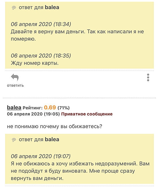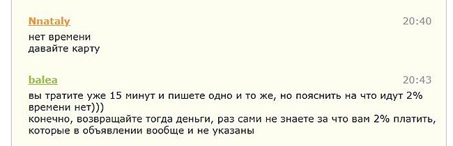 Никто не ругался, посредник Nnataly придумывает новую комиссию, которую надо оплатить после всей оплаты товара, при том в объявлении нигде ее не пишет, чем обманывает покупателей. На невинный вопрос за что эти новые проценты ей должны доплатить-сразу грубит, ведь ее карта не берет никаких процентов и больше их нигде нет, все выкупается в день оплаты по курсу. Отвечает не сразу, но оплату требует моментальную. Прилагаю скрин переписки.