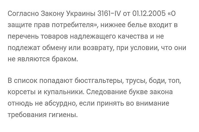 Я вам ответила, что обмен нижнего белья в принципе не предусмотрен законом, что и было указано в объявлении. Все замеры в двух размерах я вам предоставила, выбор был за вами. При покупке о возможности обмена или возврата речь не шла. Как я потом это белье должна продавать на сайте?