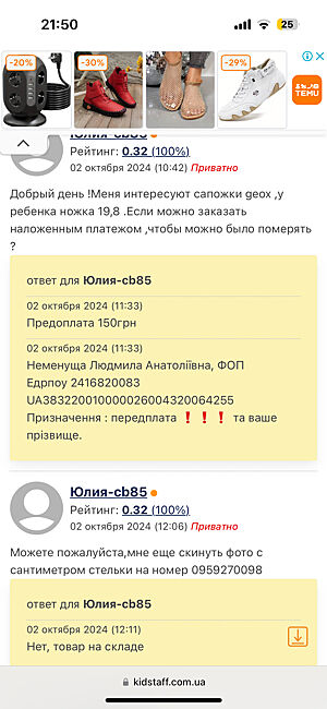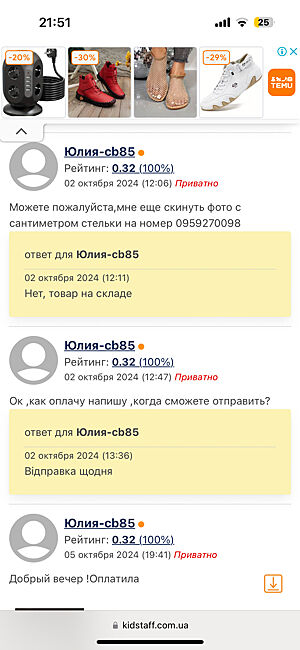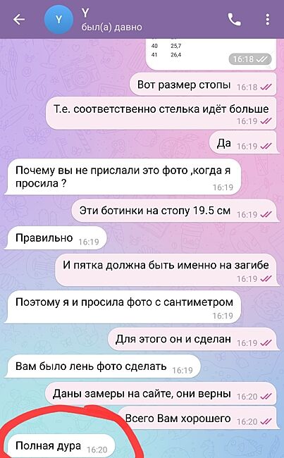 Вы действительно неадекватный продавец .Не то чтобы извиниться за свою лень ,которая просто привела меня к лишним затратам .Не берите предоплату ,если вы не умеете работать .Я изначально попросила ,мне прислать фото со стелькой и указала ,ск сантиметров у ребенка ножка .Но мне было отказано ,товар на складе .Если бы вы знали реальный размер стельки ,тогда бы не отсылали ,Размер был на 1 сантиметр мне,чем мне нужно .Вот переписка .И по фото видно ,кто действительно неадекватный