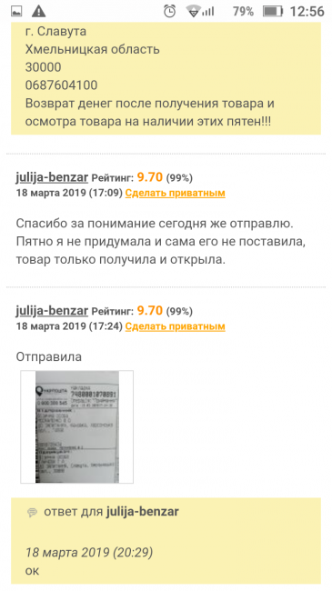 Покупець замовила костюм спортивний дитячий, хотіла отримати до 25 листопада укрпочтою, так як була затримка на фабриці, я запропонувала отримати НП з розрахунком що різницю у доставці я оплачу (РІЗНИЦЯ БУЛА ОПЛАЧЕНО МНОЮ через поповнення телефону). Я відписалась що костюм приїхав ще 24 листопада зранку, і можна йти отримувати, а потім вияснилось, що покупець чекала на смс з Нової Почти і отримала посилку, аж 27 чи 28, через що власне і вийшов інцидент. То хто кого винить в проколах??? Після оцінки покупця я написала їй в особисте (Добрий день. Таким людям як Ви, не з наявності потрібно купувати товар - а НА БАЗАРІ. І не потрібно когось робити винним, в даній ситуації Ви самі собі зробили проблему. А на рейтинг мені начхати на справді - я знаю що перед Вами я нічим не завинила. Хай це буде на Вашій совісті. Всіх благ ) і що по Вашому тут гадості??? і заблокувала так як не мала бажання спілкуватися надалі. Через те і не оцінювала покупки. А Ви ж вирішили і надалі підгадити і пишете тут.