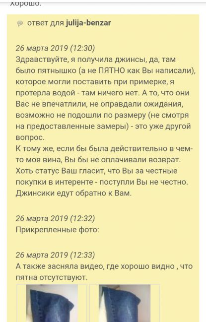 Ни о каком возврате, примерке и т.д. я с Вами не договаривалась. Покупка через интернет это всегда риск (не такой оттенок, не так вещь села и т.д.), Ваши слова "Не оправдали надежды" - это не повод для возврата. Товар был отправлен в надлежащем состоянии, без дыр, пятен и т.д. , есть фото, замеры.