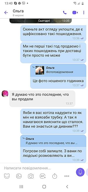Даний покупець купила у мене новий годинник, точно такий як в оголошені, по 100% передплаті, УКРПОШТОЮ. Після отримання , навіть нічого не слухаючи звинуватила мене в тому, що вона отримала поношений і побитий годинник. Коли я передзвонила їй і намагалася вияснити все і чи є акт прийому посилки почала погрожувати. Те що це могло статися і на укрпошті вона нічого слухати не хотіла. Я хотіла все вияснити і розібратися в даній ситуації, на що покупець кинула трубку. Будьте обережні з цим покупцем Вас можуть звинуватити в тому чого ви не робили!!!