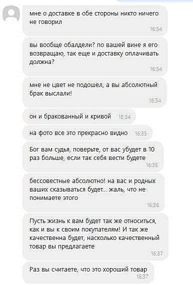 Неадекватная дама которая не дружит с головой. Не рекомендуем связываться. Выслали товар, ее не устроил, так как думает что это брак. Но это не брак а выемки заводские от пресса. Сказали хорошо, вернем деньги, только за возврат товара оплачиваете вы. Но это ее не устроило. Далее переписка и пожелания мне и моей семье, судите сами.