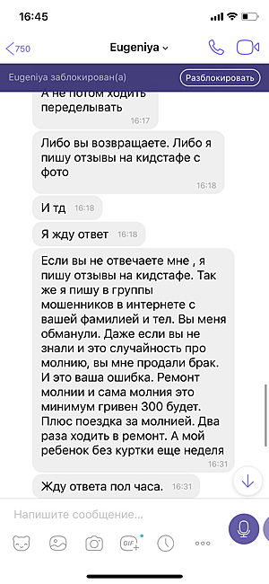 Являюсь давним покупателем на кидстаф.Как у покупателя у меня очень хорошая репутация. С такой наглостью сталкиваюсь впервые.Все же 9 негативных отзывов у данной персоны, это много. И моя ошибка, что я на это не обратила внимание. Пуховик на девочку . Идеальное состояние бу 700 гр. Куртка пришла с поломанной молнией.и продавец сказала на это "oй,я не заметила". Я потребовала возврат денег. Мне предложили оплатить ремонт. Я думаю вы сами понимаете. Ехать искать молнию, идти в ремонт. Ждать несколько дней, пока починят. Ребенок минимум 4 дня без теплой куртки. Плюс мое потраченное на хождение время. Настоятельно не рекомендую связываться с этим человеком.