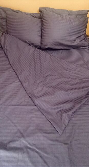 Заказала комплект по своим параметрам. Всё пошили и прислали. Наволочки немного отличаются от тех, что на картинках (без отстрочки), ткань тонкая, мягкая, но при этом плотная-упругая, приятная на ощупь. Цвет чуть голубее, с холодным подтоном, чем на фото заставки. Мой фотоаппарат тоже цвет не передал.