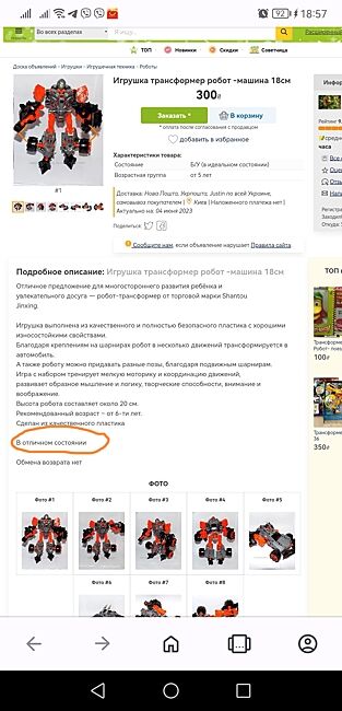 ❗❗❗❗❗Шановні покупці. Хочу вас застерегти від цього покупця. Купувала сину трансформер вказано стан чудовий, а виявилось одна деталь відломана і терер скласти не можливо. Кошти вертати не хоче. Все б нічого, але в країні війна і краще допомогти нашим воїнам ніж таким як вона заплатити 300 грн за сміття.