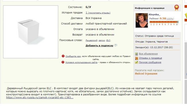 Алена, я просила Вас сделать возврат и прилагала скрин Вашего объявления, где о поломке даже речи не шло, а только о недостающих деталях, однако Вы утверждали, что не смотря на поломки (отломы) в креплениях замок устойчиво стоит и от возврата отказывались, также Вы меня везде заблокировали, поэтому я и написала в гостевую, пока не прибегая к разбирательству админов здесь и на ОЛХ.
