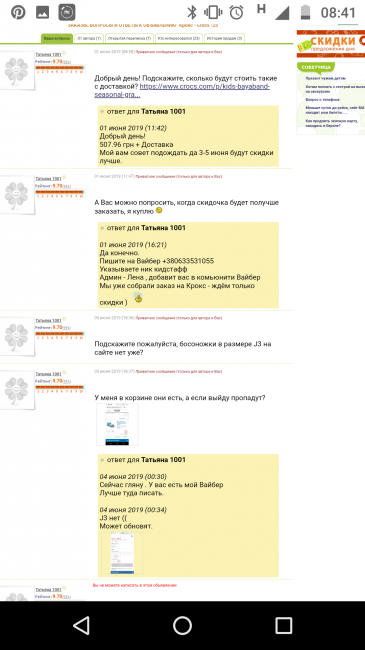 В гостевой Вам оставила объективный отзыв. Так как первый раз за все время сталкиваюсь с таким непорядочным продавцом. Заказывала Crocs себе и ребёнку 06.06.2019. Посредник сообщил, что есть компания и авио будет быстрее. Прошло 56 дней, ни обуви ни внятного ответа когда будут. Отвечая что они в Варшаве, потом Киеве, Америке и вообще она в заказах потерялась. Периодически задавала вопросы, посредник сообщал что скоро будут. При условии, что в объявлении указано доставка 7-10 дней. На последнии сообщения вообще перестала отвечать. В сети появлялась, в общей группе писала, а меня игнорировала. Лето заканчивается, а ребенок без обуви. Если бы знала, заказала у более ответственного посредника. При всей моей лояльности к данной ситуации, посредник решил написать сообщение, что он отказывается со мной работать. Но и на этом посредник не остановился, написал жалобу администратору Кидстаффа, что сделки у нас небыло, а я оставила негативный отзыв. Я в полном недоумении... Как такое вообще может быть? Заказа нет, а на моей стене написано что я его не забираю. Посредник за два месяца переписки неудосужился просчитать и написать сколько денег надо заплатить за заказ, а по окончанию переписки хотел ещё и вернуть деньги на мою карту. Поэтому я однозначно НЕ РЕКОМЕНДУЮ данного посредника для сотрудничества, хлопот не оберетесь