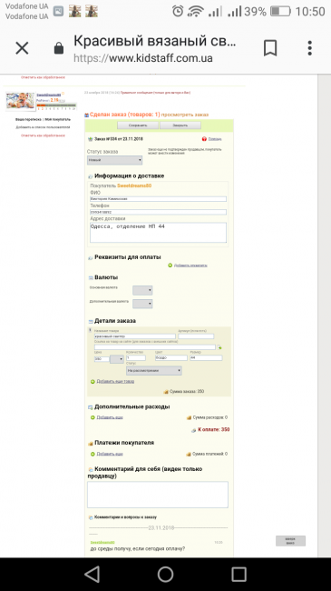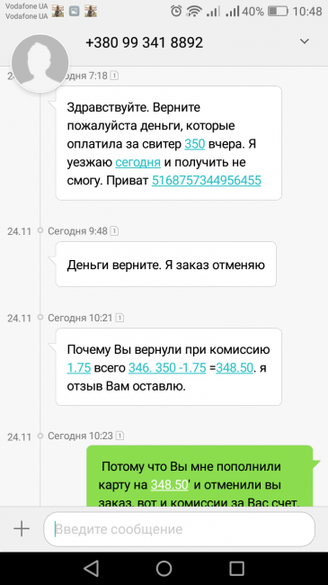 Девочки не советую покупать у этого продавца. Я сделала глупость оплатив быстро заказ и только потом почитав отзывы все. Мои вопросы после оплаты продавец игнорироваоа, хотя заходила на свою страницу. За качество и соответствие вещи переживала, так как у нее на счёт этого много плохих отзывов. Я решила отменить заказ. продавец 3 часа думала про возврат денег и вернула не всю сумму якобы рассказывая, что я не все оплатила, по скрину что я оплатила все 350