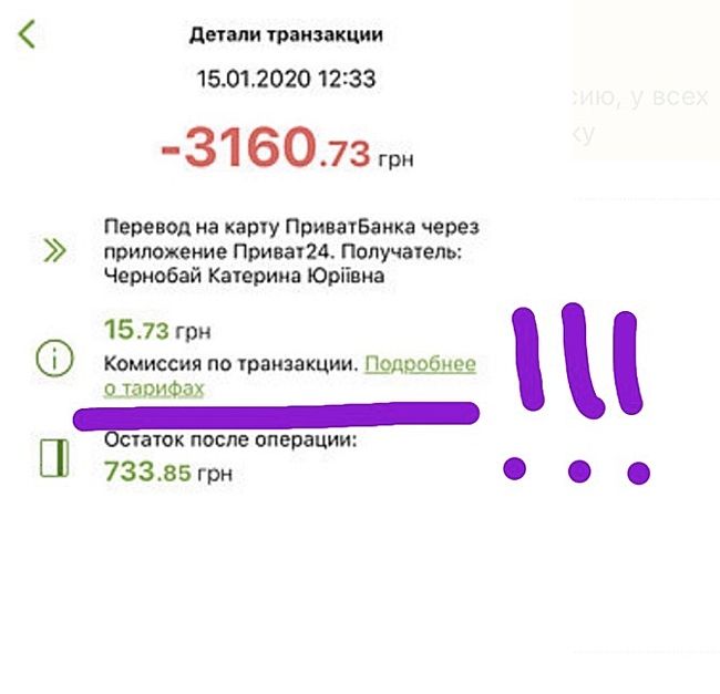 Обескураженная я стала искать информацию почему так могло произойти и единственное объяснение, которое нашла в тарифах переводов на сайте банка, это то, что продавец работает на социальной карте для выплат. В таком случае из-за «нецiльового призначенн картки» снимает с каждой стороны по 0,5%