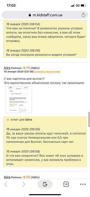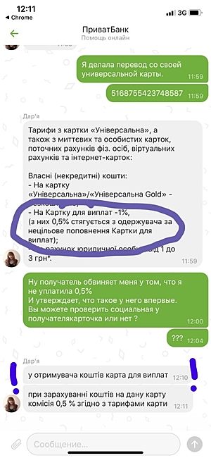 Но из за того что продавец общалась не очень приятно (хамски!!!) и настаивала чтобы я разобралась со своим банком, делая из меня дуру, я решила выяснить в чем же причина. Связалась с банком. В банке проверили по номеру ее карточки и подтвердили, что у продавца социальная карточка и потому с меня сняло 0,5% и с неё снимает 0,5%. Вообщем то же, что я и прочитала на сайте приват в тарифах комиссии переводов. Все скриншоты были скинуты продавцу, на что она ответила, цитирую: