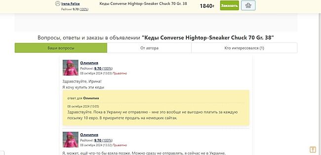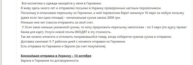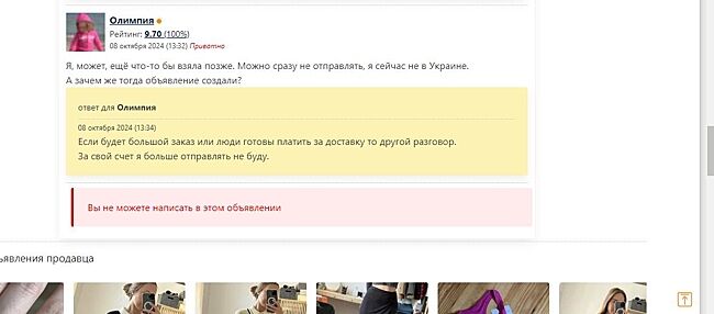Я делала несколько покупок у Ирины, последние в апреле и июне этого года. Никогда не торговалась и скидок не просила, конфликтных ситуаций не было, ничего свыше тех условий, что описаны в объявлении не хотела.