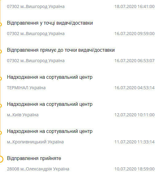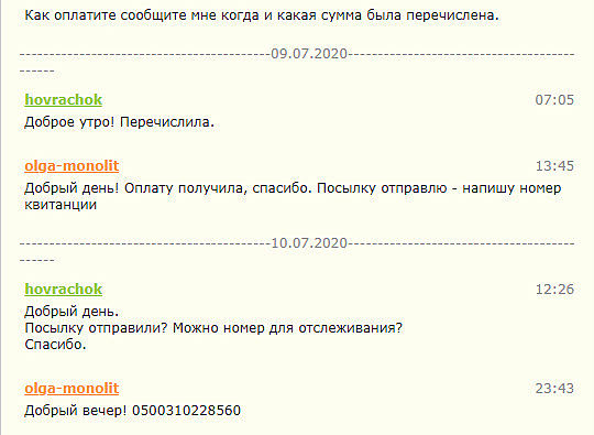 Вы у меня заказ сделали 8 июля в 20.40.. оплатили 9 июля.. я Вам отправила посылку 10 июля и вечером скинула номер для отслеживания