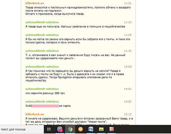 Суть Вашей претензии понятна была с первых слов, и всю эту грязь Вы лили на меня просто с целью «сбить» с меня 380грн (разница между моей ценой и акционной ценой в Черную пятницу на официальном сайте Billerbeck»), требовали чтобы я выслала Вам эти деньги на карту, отказываясь от получения заказа на почте! Извините, но я не благотворительное общество, и заходить в «минус» я не буду. Есть цена закупки, есть цена продажи, которая Вас более чем .. устроила в момент сделки. Или Вы всегда делаете возврат, если находите дешевле?