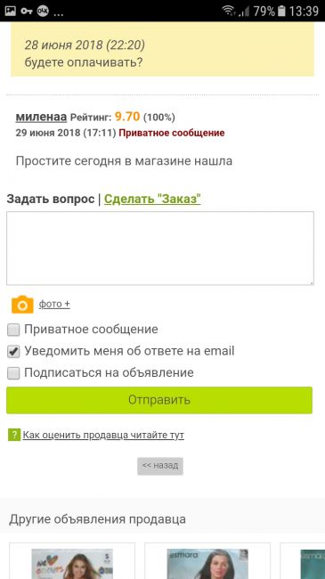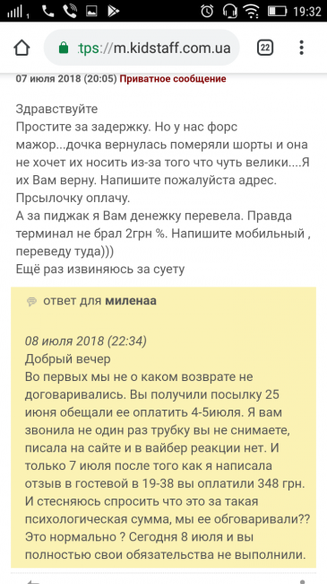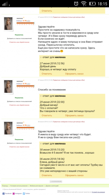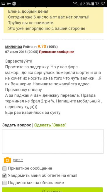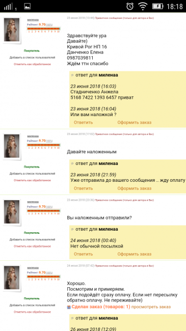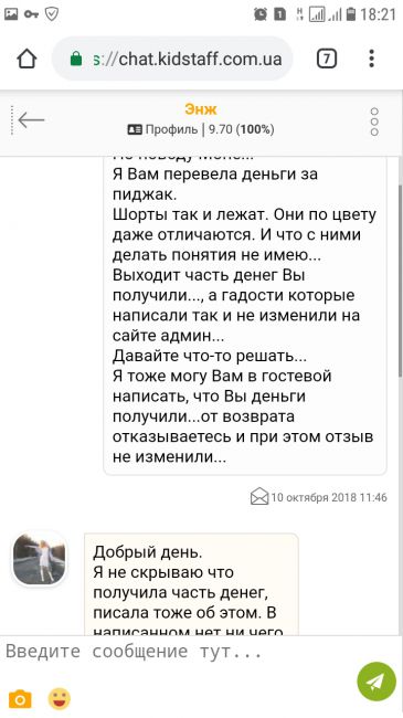 Я решила продать ребенка джинсовый пиджак и шорты в состоянии новых Angel mone любимой фирмы, и на эти деньги купить ребенку платье. Уступила Елене 300 грн.,так ей наверное мало.. Отправила посылку, хотела чтоб покупатель быстрей получил посылку и меньше платил за доставку и в итоге Елена вообще не оплатила, трубку не берет, морозится, в Вайбер ей писала... Скриншоты прикрепила.