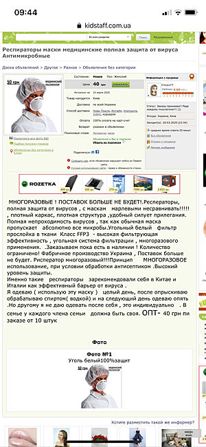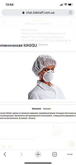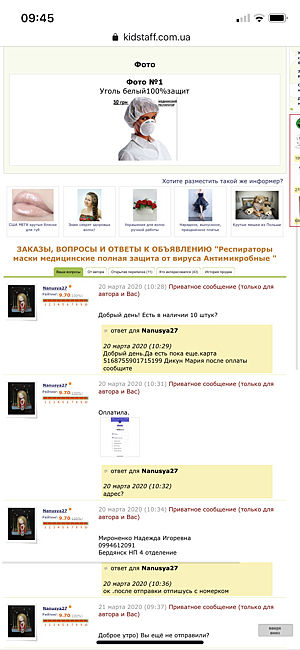 Такая мерзкая ситуация за всю историю на этом сайте у меня впервые! Человек абсолютно без совести и понятия об элементарной человечности! Маски, которые были заявлены как медицинские с угольным фильтром и продавились по 50!!!! грн за штуку, на самом деле являются простыми респираторами «лепесток», которые до короновируса никому не нужны были и по 1,5 грн. Такая подлость и цинизм просто убивают веру в людей. В покупатели данная особа меня не добавила, заведомо зная, что продаёт фуфло. Объявление после продажи было отредактировано. И она пыталась сделать из меня дуру, что про угольный фильтр там и слова не было. Но я сделала скрины. Ладно в спокойное время, но в такое время наживаться на горе людей. Я очень надеюсь, что вам это аукнется! То на чем наживаетесь пусть вас и накажет. На первых двух фото объявление до редактирования. На 3-м фото что мне пришло. На 4-фото отредактированное объявление, где многоразовый медицинский респиратор превращается в «гигиеническую маску для краткосрочного использования».