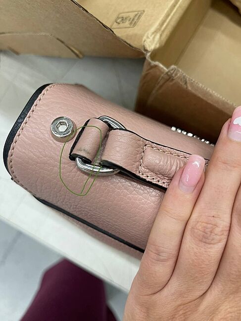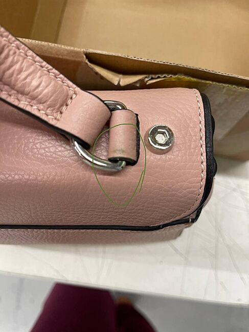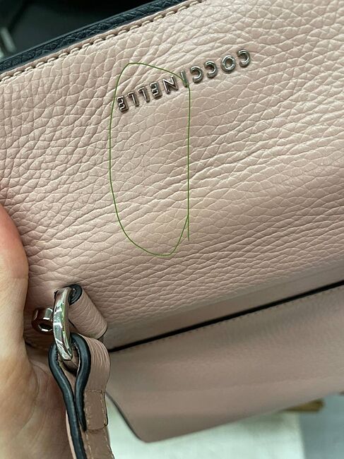 Сумка Coccinelle c дефектами в виде: одной большой царапины на лицевой стороне сумки, одной маленькой царапины на задней стороне сумки и потертостей на ручках.