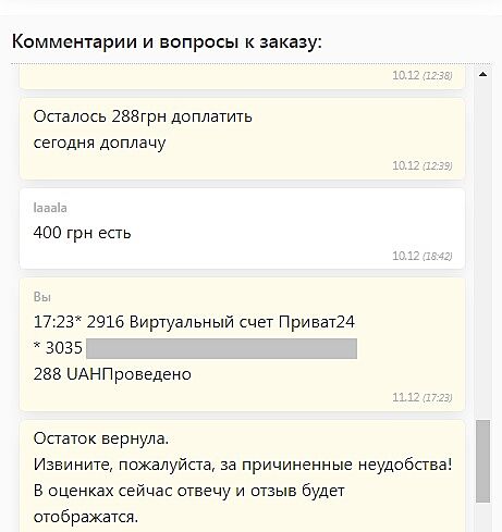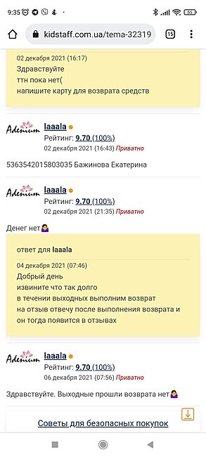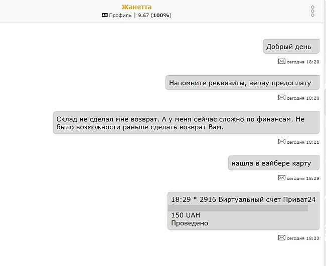 У меня к сожалению тоже отрицательный отзыв, за 10 лет на Кидстафф, такая ситуация впервые, посмотрела на рейтинг только, а отзывы почитала уже когда поздно было. Заказала куртку у продавца, ещё 16 сентября, обещала возврат и обмен без проблем если не подойдёт товар. Но увы!!! 695 ГРН МНЕ ТАК И НЕ ВЕРНУЛИ!!!! Возврат 2000 грн производился частями на протяжении двух месяцев, а последнюю часть выпрашивала месяц, но только одни обещания... ЧИТАЙТЕ ОТЗЫВЫ ПЕРЕД ПОКУПКОЙ ОБЯЗАТЕЛЬНО