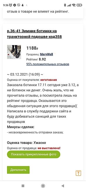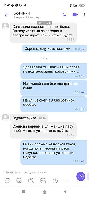 Не связывайтесь с этим продавцом!!! Почти месяц как отправила деньги за зимние ботинки. Спустя 2!!! Недели ожидания отменила заказ, и теперь уже неделю жду возврата денег. Мало того, что осталась без ботинок в мороз, так ещё и выпрашивать свои деньги нужно. Каждый день только обещания, что завтра отправим, а по факту никаких действий