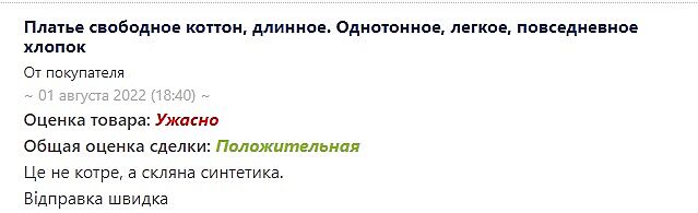 Заказ на платья за 320 грн и 440грн. Клиент просит скидку при покупке 2х товаров. У нас самые низкие цены и самое достойное качество, так как мы производители - куда еще скидку? Вы в магазине тоже торгуетесь - вам ведь ответили, что оператор не может предоставить скидку. Зачем недовольство? В обьявление каждом пишем для таких как вы! Товар соответствует цене! Клиент пишет негативный отзыв, что это не котре, а скляна синтетика. Что такое котре мы не поняли, но клиент особа конфликтная и неприятная. Не нравиться товар - можно договориться о возврате. Зачем писать гадости непонятно? Надеемся вам это принесло пользу. Если вы хотели натуральную ткань за 300-400 грн.? Вы цены в магазинах видели? Я думаю да - поэтому и пришли в интернет за покупкой ища дешевле! На моделях не написано что это скидка! Полностью натуральная ткань от 600грн платье длины до щиколотки как вы заказали + еще за пошив и работу швее оплатить - посчитайте! Поэтому не фантазируйте в дальнейщем что за 3 грн. можно купить натуральное. Жаль что такие вот фантазеры портят рейтинг. УЖАСНО это вы, а не наш товар. Вам в доказательство 10+ положительных оценок и фото отзывы. Приглашаем всех покупателей к нам за покупками у нас найдете много новинок по приемлемой цене. А вас мадам в черны список. Ищу рыщу дешевле найти хочу, скидку на самый недорогой товар требую, не дадите я недовольна всем - только сказок не бывает.