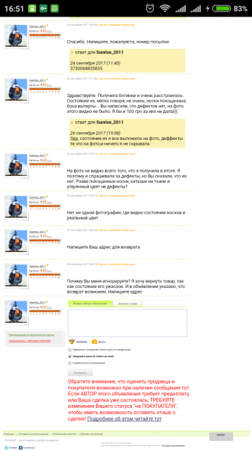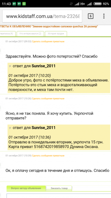 Девушка поступила по-свински, выслала товар в ужасном состоянии с дефектами, хотя в переписке я уточняла состояние, и она сказала, что дефектов нет, ссылаясь на фото в объявлении, на которых их просто не видно. Возврат делать не собирается и сообщения игнорирует. Очень неприятно, т.к покупаю бу не от хорошей жизни. В покупатели не добавила, отзыв написать не могу. Фото полученных ботинок и скрины переписки прилагаю http:http://www.kidstaff.com.uatema-21261262.html