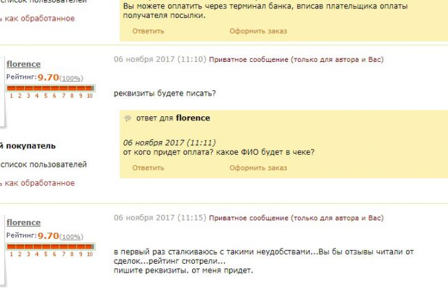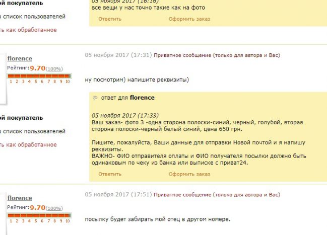 Подписываюсь под каждым негативным отзывом, а их тут достаточно! Сделка не состоялась. Хотела купить в подарок отцу шарф. Оплатить и напрямую отправить ему в другой город. Потратила на переписку достаточно времени(продавец не особо оперативен) ...Так нет же, со мной не соизволили дальше продолжать переписку, так как ФИО плательщика не отвечает ФИО получателя (хотя, фамилии у нас с папой были бы одинаковые):)...Бред!..Действительно чувствуется пренебрежение, о котором уже писали...Надеюсь покупатели будут внимательны и читая отзывы не будут тратить свое время на таких продавцов.
