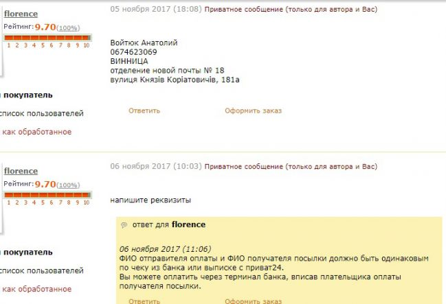 Всем уже давно известна мошенническая схема трех. Поэтому всем своим покупателям всегда пишу- ФИО отправителя оплаты и ФИО получателя посылки должно совпадать по чеку или выписке из приват24.