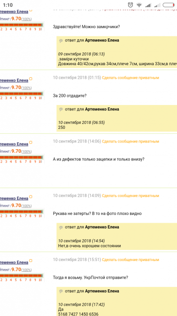 Покупала курточку, по словам в отличном состоянии, было указано что только зацепочки немного на ткани. Я уточнила "зацепки только внизу?" " И не затерты ли рукава?" мне ответили, что нет! Что все в отличном состоянии. Когда я получила куртку, то была в ШОКЕ! Во первых зацепки спереди возле замка просто повсюду! На рукаве большое жирное пятно. А цвет совсем не соответствует фото, об этом тоже ничего небыло сказано в описании! На фото нюкурточка была персикового красивого цвета, а в реальности бледно-розовая! На мои просьбы вернуть мне деньги из за ее лживой информации, продавец просто отписывает, что она указа что возврата нет. НИ В КОЕМ СЛУЧАЕ НЕ СОВЕТУЮ ЭТОГО ПРОДАВЦА!