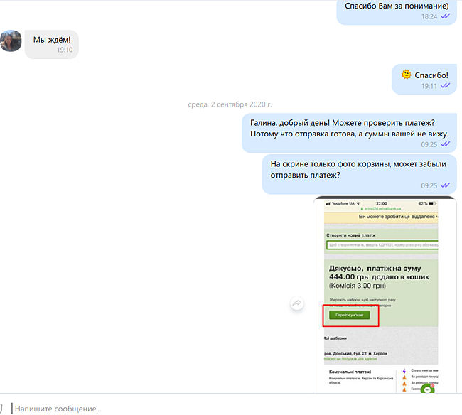 Покупатель после выбора товара и переписки, сказала, что хочет оплатить на карту. И после скинула скриншот оплаты. Сразу я не посмотрела, приготовила товар на отправку, как оказалось деньги на карту не пришли. А на скриншоте, что отправила Галина - корзина, а не сообщение об оплате. Мы созвонились, покупатель уверяла, что деньги с карты ушли и нужно выяснять через банк, но рюкзак просила слезно отправить, так как ребенок очень ждет, ведь школа уже началась. После слов "400 грн. разве деньги, чтоб брать на себя грех - я разберусь с банком или переведу снова", я здалась. Конечно теперь жалею о такой необдуманности и доверчивости.