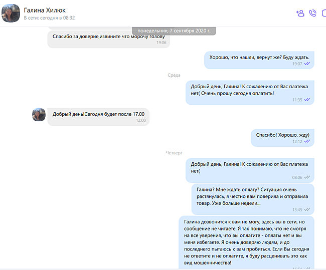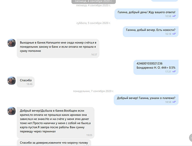 Думаю, что понятно (и переписка подтверждает) - деньги Галина не перевела, а через неделю совсем отморозилась.