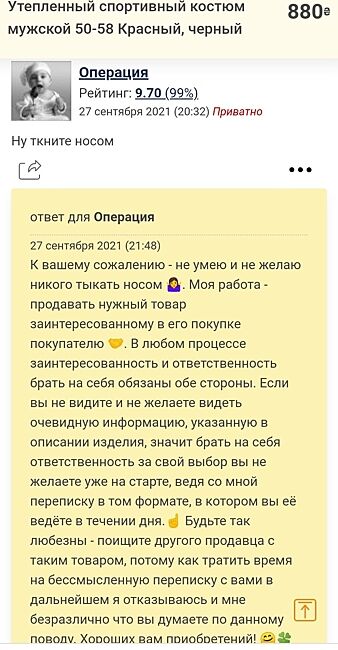 Во вторых, по вашей рекомендации, я купила костюм у продавца другого, который ответил на ВСЕ вопросы и даже глупые 😋