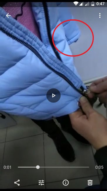 Вы устроили цирк о браке в 21-45, другого времени не нашлось , на тел звонки не отвечает , я распинаюсь в вайбере , рассказываю человеку, что не вставили до конца молнию в бегунок, а на видео ответ КУРТКА НА РЕБЕНКА ОГРОМНАЯ ДАЖЕ РУК НЕ ВИДНО вот скрин с видео на 5 секунд!!! который вы мне прислали со своими претензиями