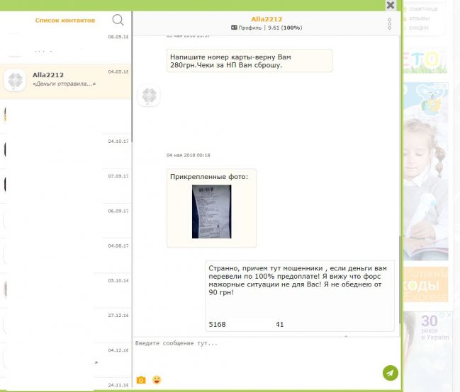 Вы себе противоречите и сами сделали проблему с обычной сделки. То я хороший покупатель - то плохой. Людям вы пишите: "Сделала возврат посылки,попала на 90грн" и ждете жалости к себе, а по факту сами мне пишите : 03 мая 2018 23:57 "Напишите номер карты-верну Вам 280грн (цена покупки 370 грн).Чеки за НП Вам сброшу. (реально отправили только один чек, а второй так и не прислали). Спасибо, что хоть вернули 280 грн. :)